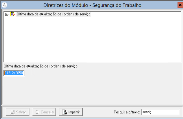 Ao acessar o módulo de Segurança do Trabalho (ST), o sistema atualiza automaticamente e diariamente as Ordens de Serviço. Caso não deseje que essa atualização seja executada ou queira definir uma data futura, é possível realizar o ajuste por meio da alteração de uma diretriz.