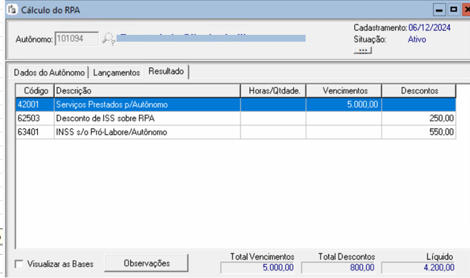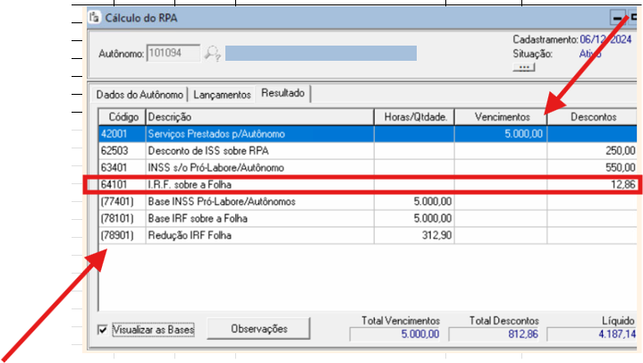 O sistema estava calculando desconto de IR de 12,86 para cálculo de RPA com base salarial de 5.000,00: