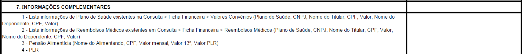 a. Listar apenas as informações de convênios médicos que estejam registradas em Consulta > Ficha Financeira > Valores de Convênios. VDB lançados exclusivamente na folha de pagamento, sem identificação do beneficiário, não serão listados no Quadro 7 – Informações Complementares.