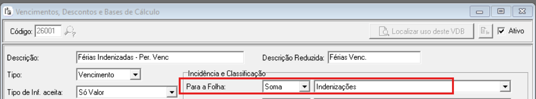 • No VDB, a verba deve estar enquadrada na classificação da folha como Indenizações