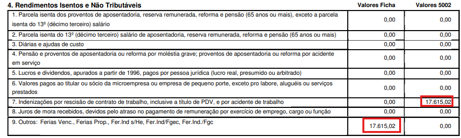 12. Como proceder quando o Relatório com Programa RHPR1995 – Carta de Rendimentos eSocial tiver diferença na coluna Valores Ficha no Quadro 4 Rendimentos Isentos e Não Tributáveis Item 9 e coluna Valores 5002 Item 7 ?