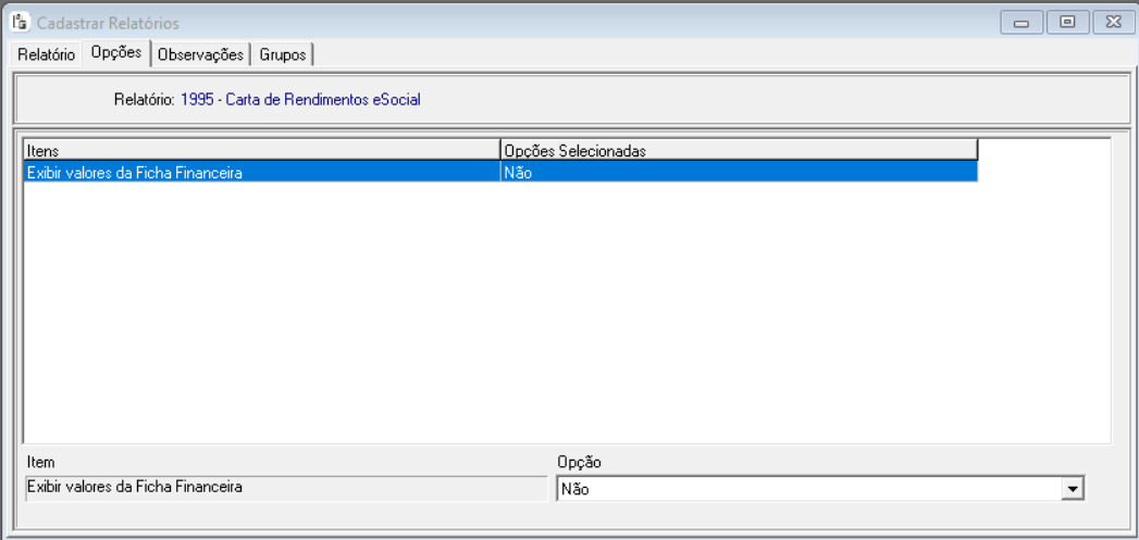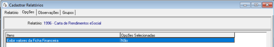 Para a Pessoa que teve esta diferença do VDB Estorno de Férias com o INSS Férias e Folha Mensal na competência o resultado é negativos faz necessário entrar o Relatório com Programa RHPR1995 – Carta de Rendimentos eSocial para isso no menu Arquivo > Cadastrar Relatórios, faça uma cópia do relatório (código livre ou 1996) e na guia Opções no item Exibir valores da Ficha Financeira informe não.