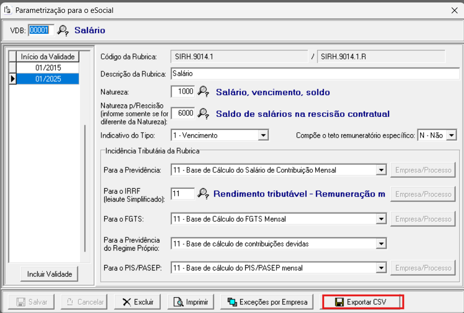 Ajuste a parametrização de IRRF da rubrica na última validade do VDB no SIRH.