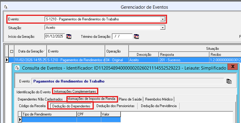 Após consulte S-1210 - Pagamentos de Rendimentos do Trabalho para identificar se foi considerado o dependente ou não.