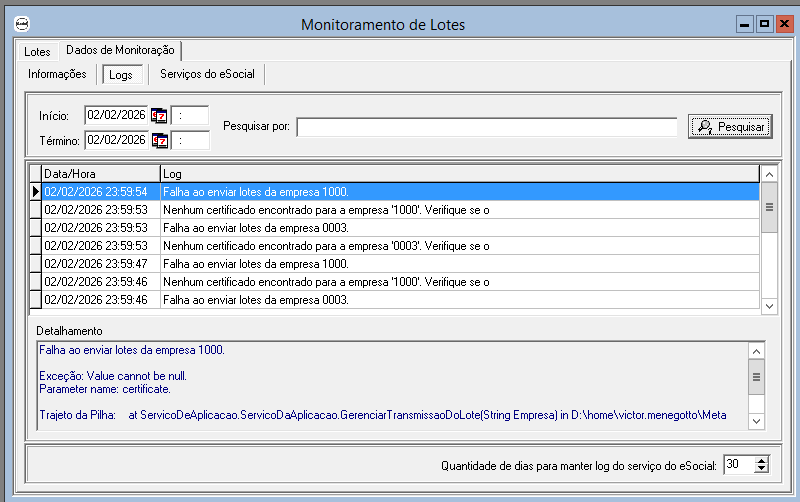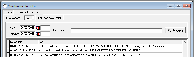 - No menu Gerenciamento > Monitoramento de Lotes na guia Dados de Monitoração > Logs