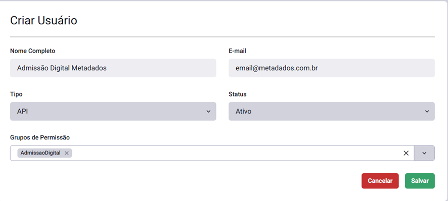 Este usuário será utilizado para autenticar nas APIs do SIRH para comunicar com o novo Admissão Digital Metadados.