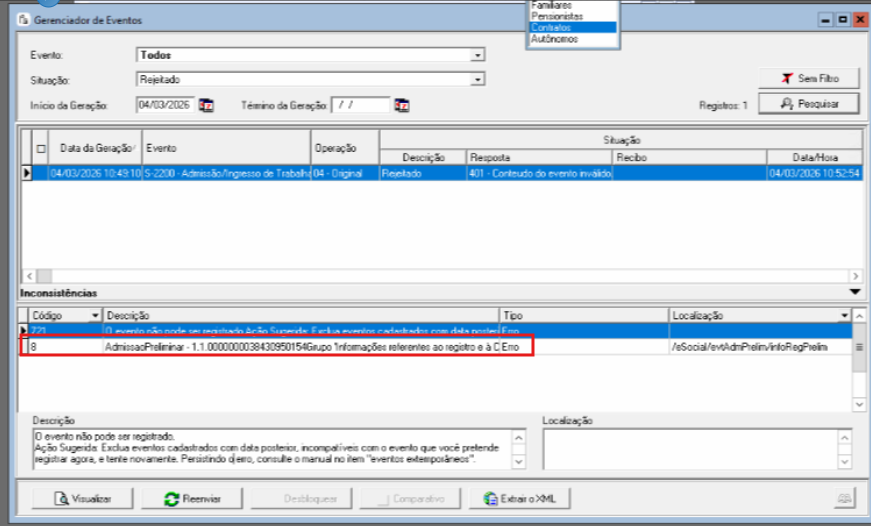 Menu eSocial > Gerenciador de EventosLocalize o evento S-2200 que foi rejeitado.