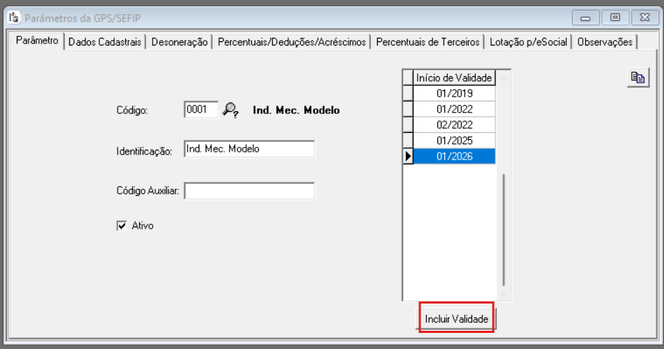 Incluir nova validade para a competência em que começa a mudança