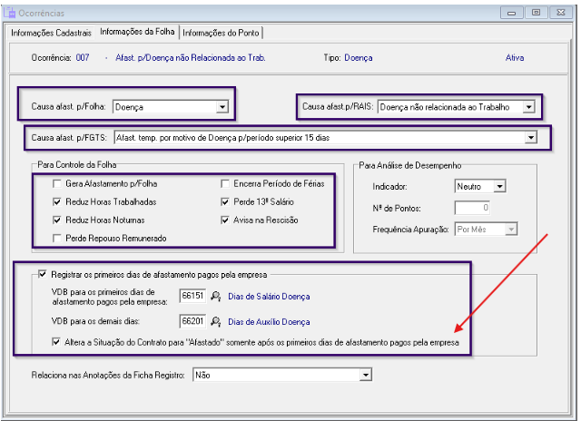 Para que o sistema considere o contrato como afastado assim que for lançado o atestado médico devem ser feitas as seguintes configurações no cadastro de ocorrências: