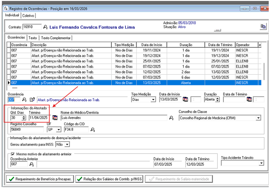 Se este campo estiver marcado, o sistema vai olhar para as informações de atestado preenchidos no registro de ocorrências e só vai considerar a situação do contrato como afastado após o período informado.