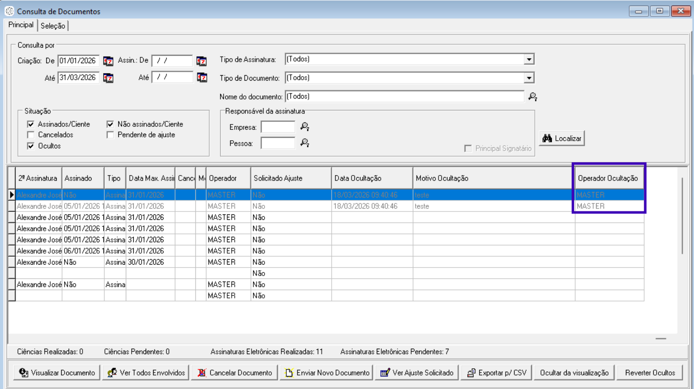 Ajuste no SIRH para gravar operador em campo separado na ocultação de documentos no SIRH. Arigo: Como ocultar documentos da tela Consulta de Documentos do SIRH