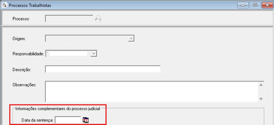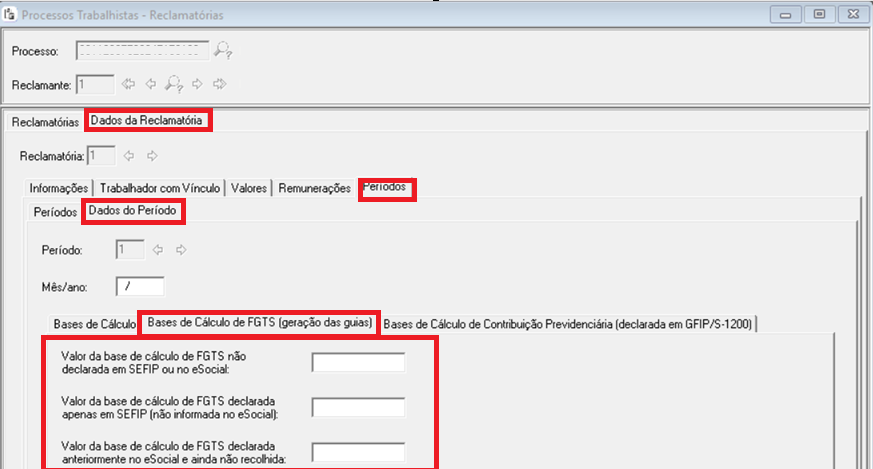 - Campo {vrBcFGTSProcTrab}: devem ser informadas apenas as bases de cálculo do FGTS ainda não declaradas em GFIP ou no eSocial, inclusive verbas complementares reconhecidas no processo trabalhista.