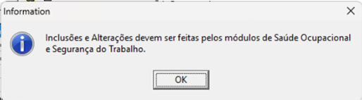 "Inclusões e Alterações devem ser feitas pelos módulos de Saúde Ocupacional e Segurança do Trabalho".