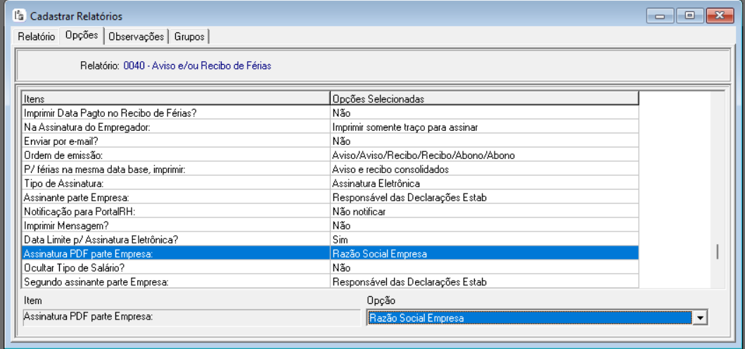 - Razão Social da Empresa: imprime a razão social da empresa no Aviso de Férias;