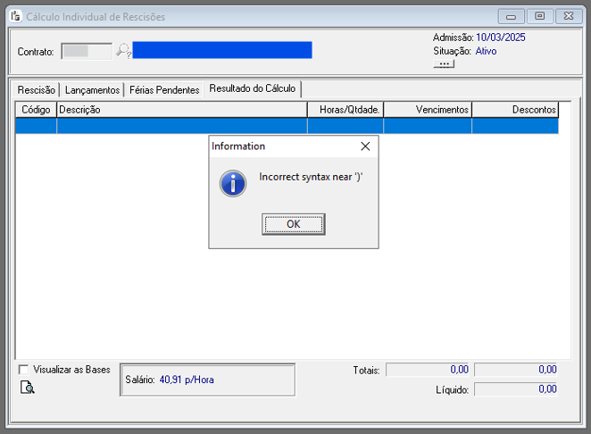 Ao calcular uma rescisão e ao salvar o sistema apresentar o erro: