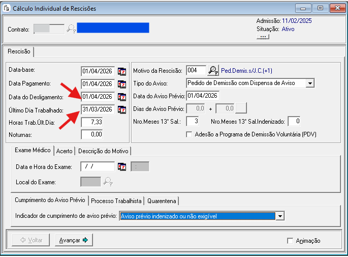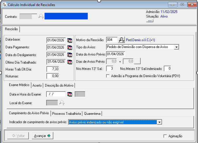 A imagem acima diz que o desligamento foi em 01/04/2026 com o último dia trabalhado em 31/03/2026 e com isso, a rescisão não calcula nenhum valor, pois o colaborador não tem nenhum dia trabalhado no mês do desligamento.