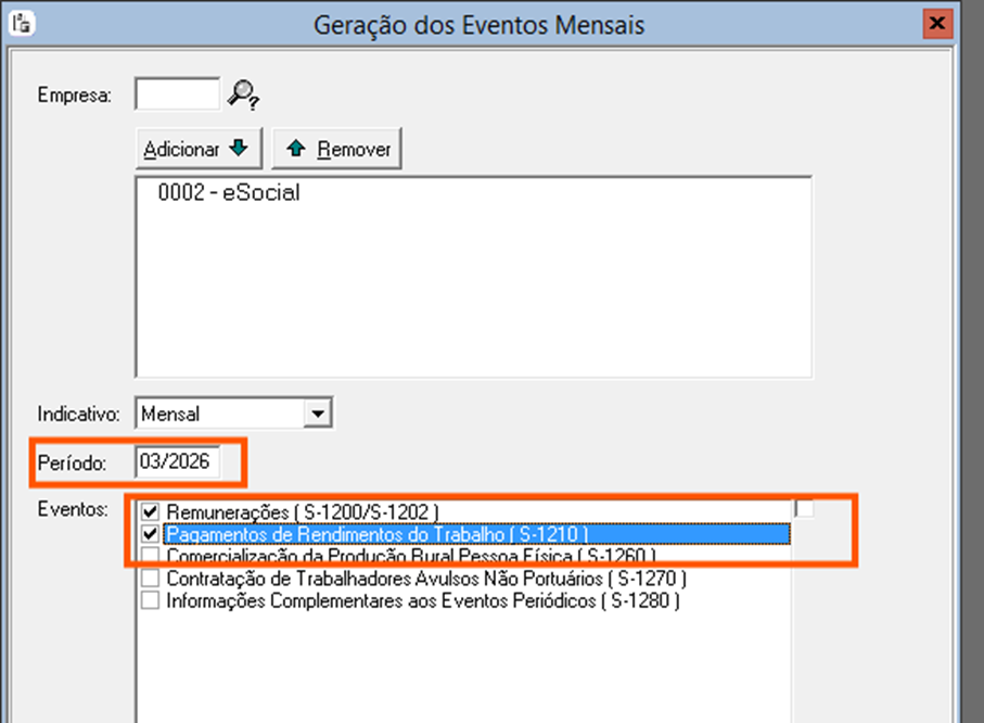 Ao enviar os eventos para eSocial, seleciona-se os eventos S1200 e S1210 da competência 03/2026.